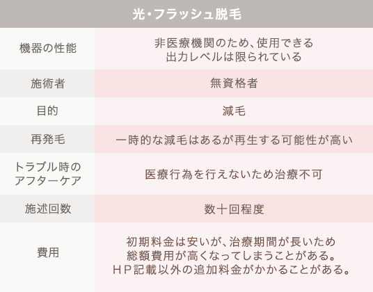 | 医療レーザー脱毛 | 光・フラッシュ脱毛 | |