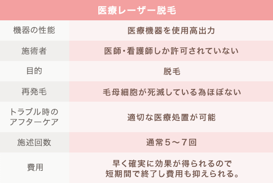 | 再発毛 | 毛母細胞が死滅している為ほぼない | 一時的な減毛はあるが 再生する可能性が高い |